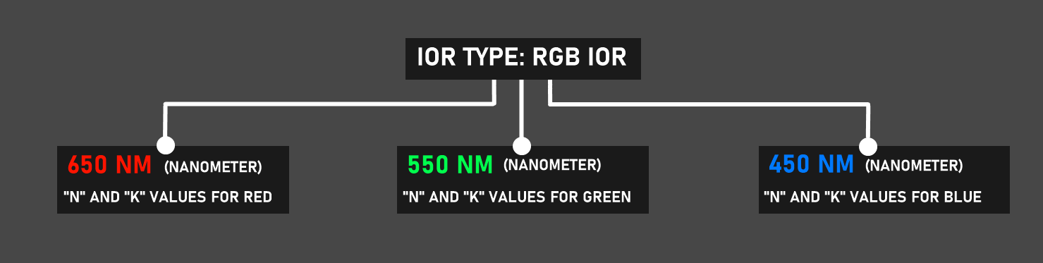 最准确的 IOR 是 RGB IOR。使用可见光谱的波长,为每个颜色通道(RGB)指定单独的 n 和 k 值。镜面颜色被禁用。下面的图像显示了 RGB 通道的波长:红色为 650nm,绿色为 550nm,蓝色为 450nm。