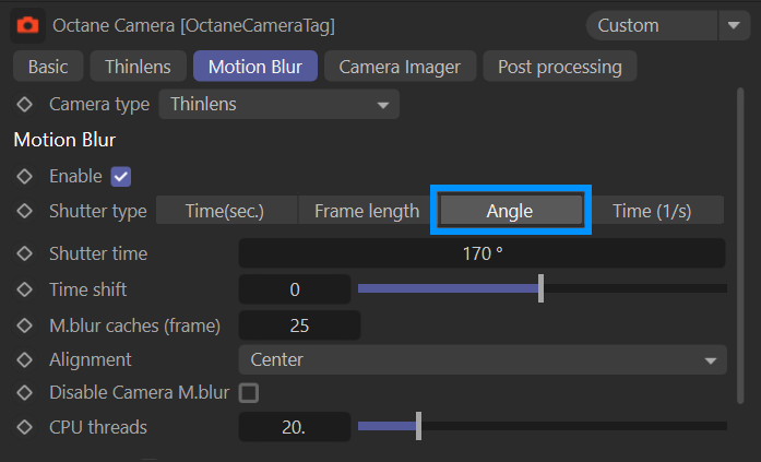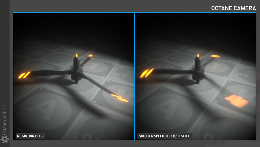 相机运动模糊是当场景中的相机处于运动状态时记录的运动模糊类型。它与对象运动分开处理,可以在特殊情况下禁用。Octane 将创建运动模糊以匹配物理相机和镜头,这是快门速度、快门角度和曝光时间组合的结果。摄影和高端运动相机上的快门要么是物理机械的,要么是"全局的",这意味着它们可以在同一瞬间捕获完整帧,而许多(通常较便宜)数码相机使用电子快门(滚动快门),这可能会使帧中的元素倾斜,否则这些元素将是垂直的。快门的简单示例是从其一部分中移除槽的圆盘。这个开放部分允许光线击中胶片或传感器并曝光图像。此过程创建了如何在图像中记录运动对象的可识别效果。