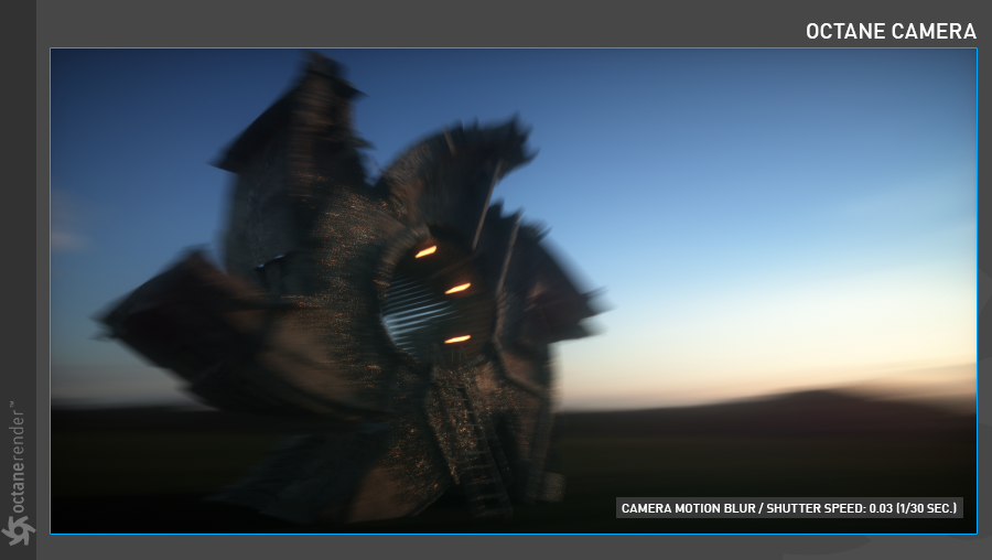 OctaneRender® 中的运动模糊既快速又照片真实,因为 Octane 正确地模拟了光线通过镜头和快门系统捕获的方式。要获得精确的模糊,请调整快门值相对于场景的每秒帧数值。也可以通过使用更长的快门持续时间来干扰现实并获得"狭缝扫描"效果,就像"2001:太空漫游"中的那样。