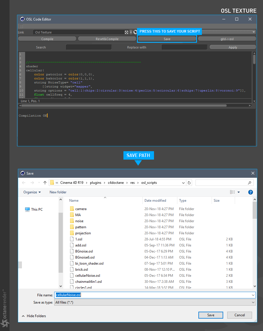 您可以在编辑器窗口中保存编写的脚本或创建新类别。要执行此操作,按"保存"按钮,将弹出 Windows 资源管理器或 Mac 查找器窗口。默认情况下,插件会将您带到保存脚本的文件夹。但是,保存脚本的位置是"C:\Program Files\MAXON\ Cinema 4D [version]\plugins\ OctaneRender for Cinema 4D\ res\ osl_scripts"文件夹。在这里,您还可以打开新文件夹并将脚本保存到其中。这将创建一个新类别,您可以在 OSL 脚本窗口中看到它。