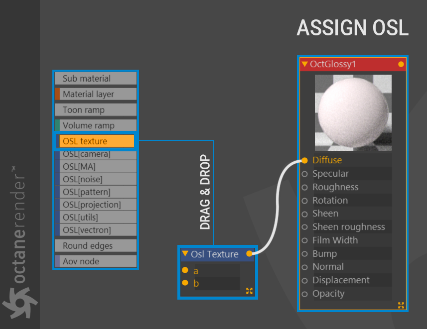 首先创建一个 Octane 漫反射材质并打开节点编辑器。将您创建的漫反射材质拖放到节点编辑器中。然后从节点编辑器左侧的 OSL 组中选择所需的 OSL 节点,并将其拖放到编辑器区域中。将此 OSL 节点连接到漫反射材质的"漫反射"通道。