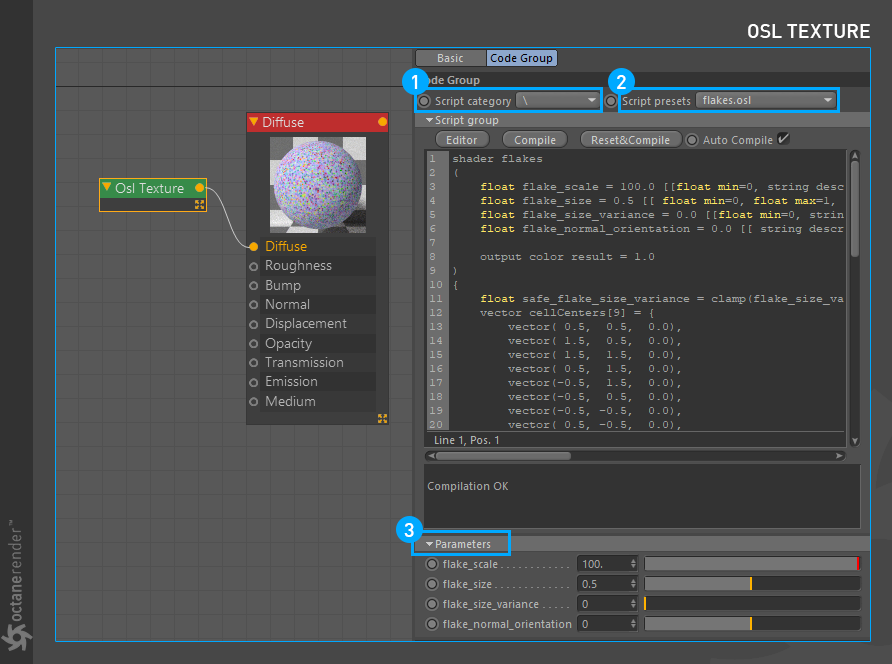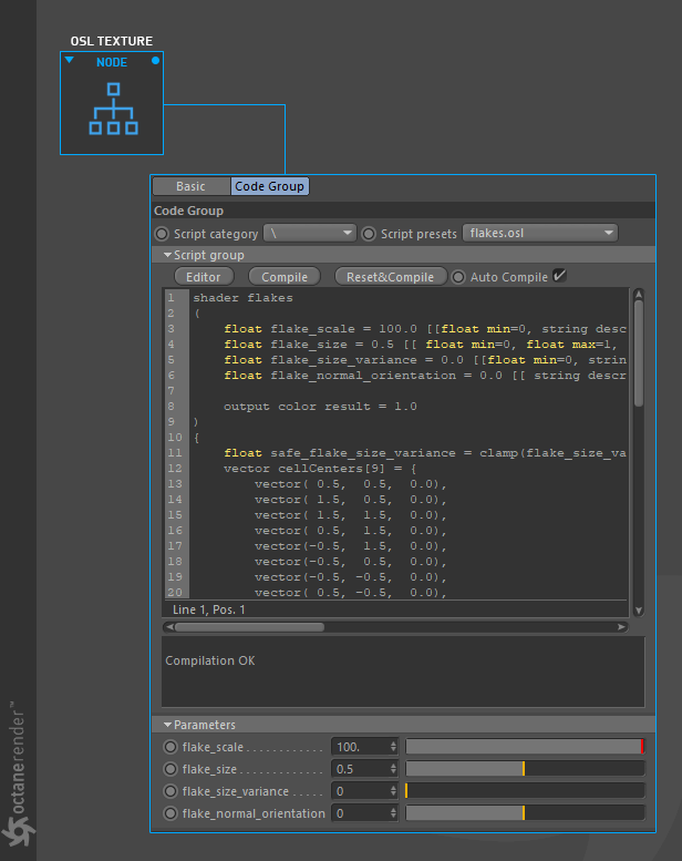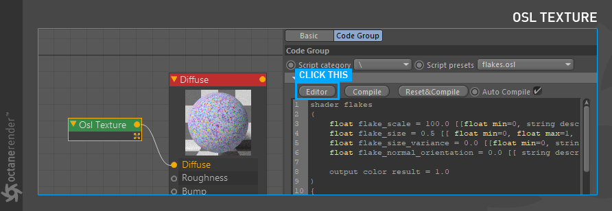 这将打开 Octane OSL 编辑器。您将在此编辑器中编写、编译和完成代码。