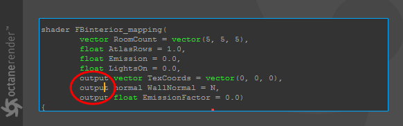 例如,您在下面图片中看到的一些代码是在网上找到的。当我们在 Octane OSL 编辑器中尝试使用此代码时,我们遇到"输出"错误,因为 Octane OSL 目前不允许使用多个输出。只有一个输出可用。