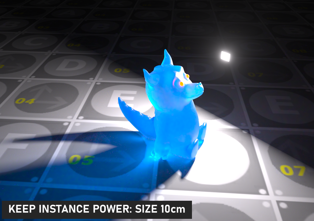 在 表面亮度禁用 且 应用统一缩放 到对象时启用此选项会导致 功率 保持恒定,如下面的图像所示。灯光的大小已更改,但照明输出相同,无论灯光大小如何,启用 保持实例功率 时。请注意,阴影和焦散将符合灯光的大小,如预期的那样。