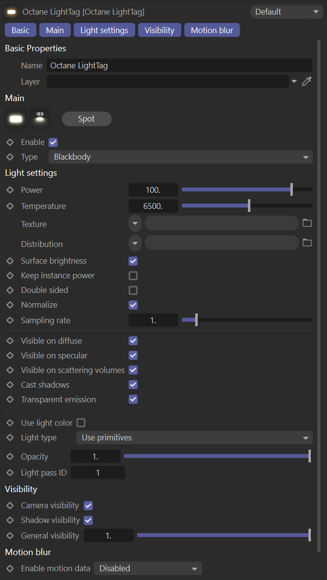 Octane 灯光标签通过在 OctaneRender® 中添加灯光来创建,然后同时向新灯光添加"灯光标签"。所有与灯光相关的设置(Cinema 4D 提供的灯光属性除外)都位于 Octane 灯光标签中。灯光标签由五个标签组成: 基本、主、灯光设置、可见性 和 运动模糊。基本标签是经典的 Cinema 4D 标签,您可以在其中命名灯光并选择灯光所在的层;其他标签在以下部分中说明。