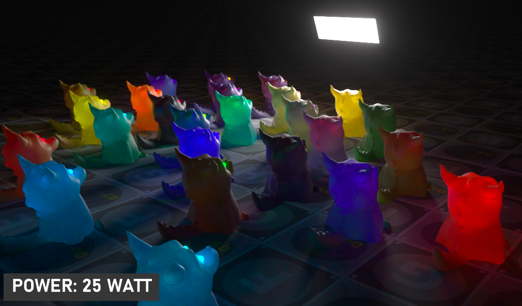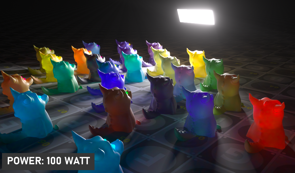 功率属性值以瓦特表示光能。要获得真实的渲染输出,请在功率设置中输入真实世界的灯光瓦数,代表所需光源的适当值。例如,标准灯泡瓦数通常在 25 到 100 瓦之间,辐射亮度约为 250-1600 流明。在相同的流明范围内,卤素灯泡为 18-72 瓦,亮度与标准灯泡相同。LED 灯泡在标准灯泡亮度范围内为 4-20 瓦。当然,可以使用任何值,但如果需要真实的结果,最好坚持使用已知的瓦数值。