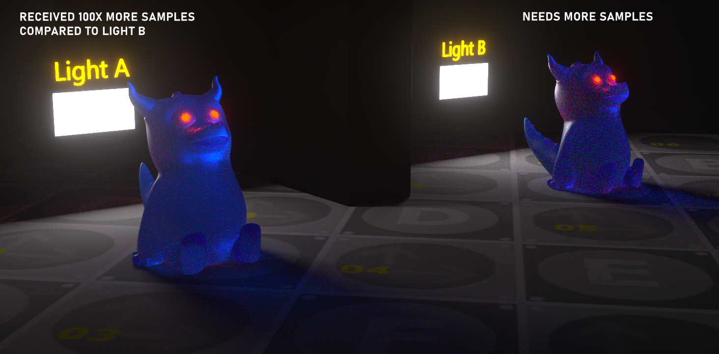 采样率 determines 将用于投射光的着色中的采样数。在某些情况下,场景中可能有多个灯光,其中一些可能会在某个区域产生噪波。在这种情况下,您可以通过为给定灯光定义更多采样来减少噪波。但是,在执行此操作时,您可能需要设置其他灯光的采样率,因为此选项作为"比率"工作。您可以将场景上的黑体发光视为"采样加权"。在下面的示例中(未进行降噪),"灯光 A"的采样数是"灯光 B"的 100 倍,后者噪波更大。在大多数情况下,默认值 1 足够好,除非渲染中出现特定问题,否则您不需要更改它。