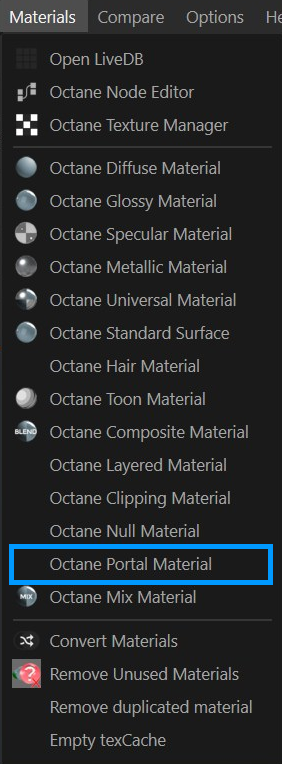 要创建门户材质,请前往 Live Viewer > 材质菜单,选择 Octane 门户材质。一个新的门户材质将被添加到材质管理器中。