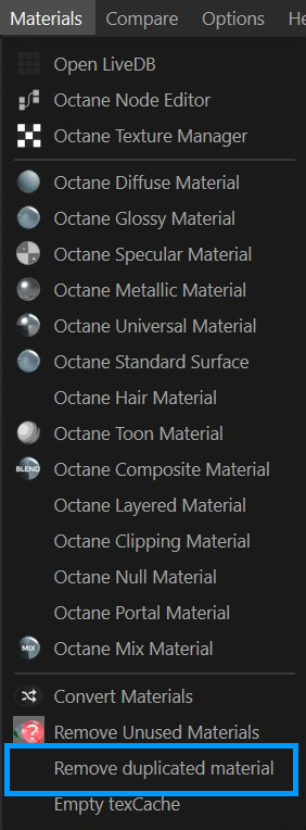 此选项会从 Cinema 4D 的材质管理器中移除所有重复的材质。
