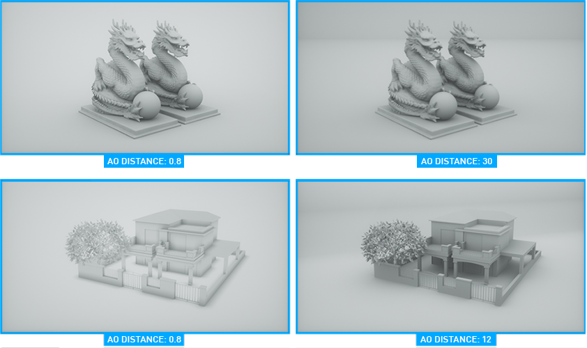 - 环境遮挡 AOV — 根据其他几何体的遮挡量,为相机射线的命中点分配颜色。AO 距离选项控制环境遮挡阴影的扩散距离。应根据场景中对象的比例调整此设置,以获得真实的结果。例如,较小的值更适合玩具等小对象,而较大的值适合房屋等对象。 使用此选项启用 AO Alpha 阴影,否则结果将包含额外信息。