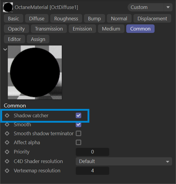 通用(Common)选项卡 中启用 阴影捕捉(Shadow Catcher) 选项。该材质