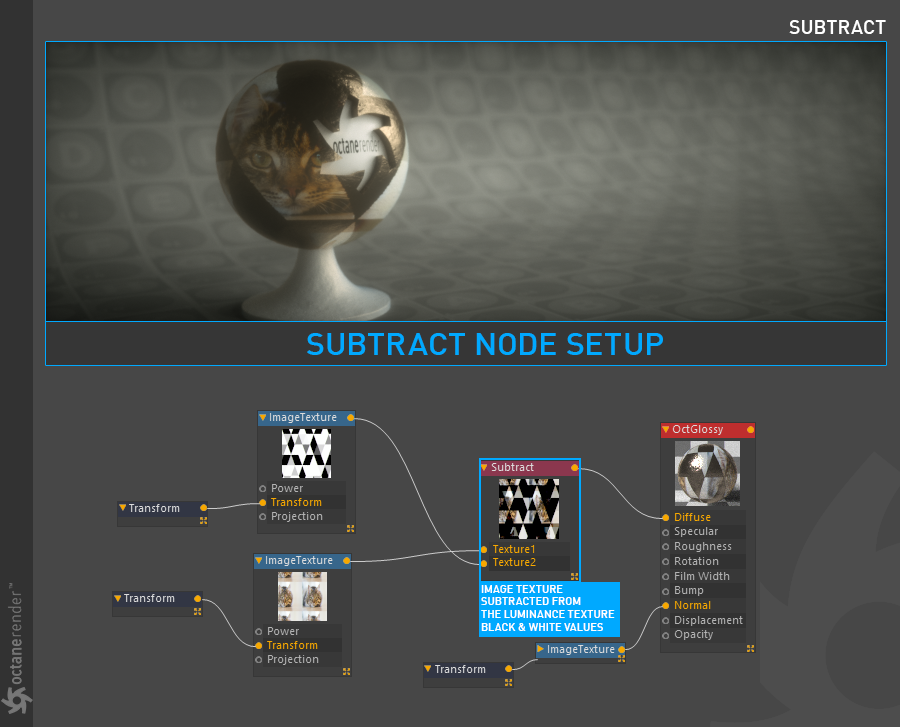 Subtract 纹理节点用于将一个纹理的数值从另一个纹理中相减,其行为类似于 Photoshop 中的“相减”图层混合模式。