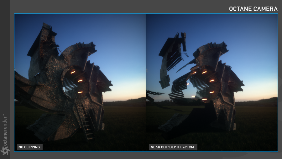 该功能主要用于室内场景,当你希望拍摄整个房间,但由于需要将相机放置在房间内部而不得不使用非常大的视角时。通过相机裁剪(近裁剪平面),你可以将相机放置在房间外部,降低视角,并逐步增加前方的裁剪平面距离,直到最近的墙体被裁剪掉。几何体本身并不会被修改,只有相机裁剪会生效,这意味着阴影、反射和折射仍然会受到被裁剪几何体的影响。