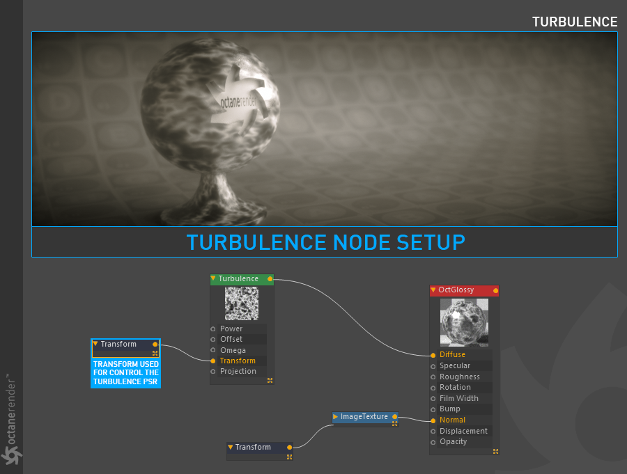 打开节点编辑器,并按照下图所示进行节点搭建。在该示例中,一个湍流节点被连接到材质的漫反射通道。使用渐变节点来设置湍流的颜色效果,并使用变换节点来修改该节点的 PSR 数值。