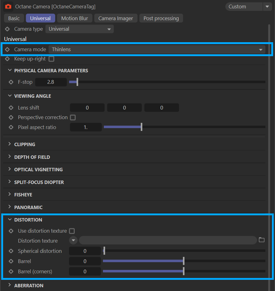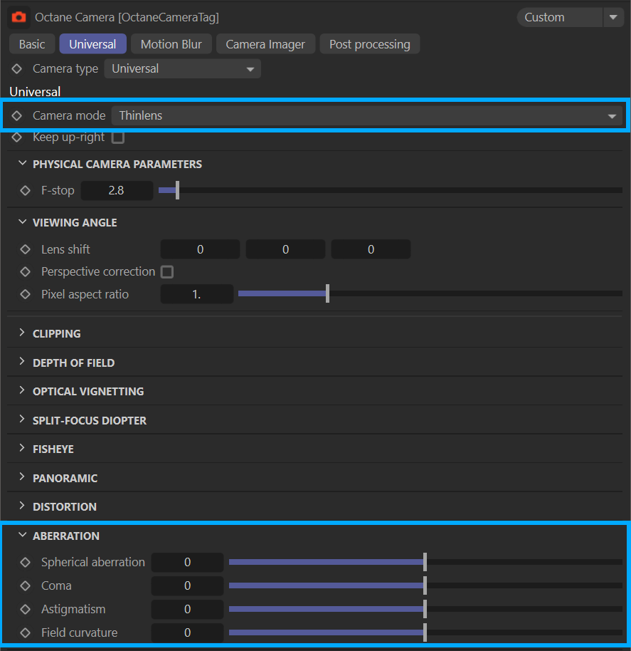 - 薄透镜- Octane 默认的相机类型。