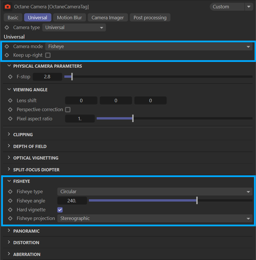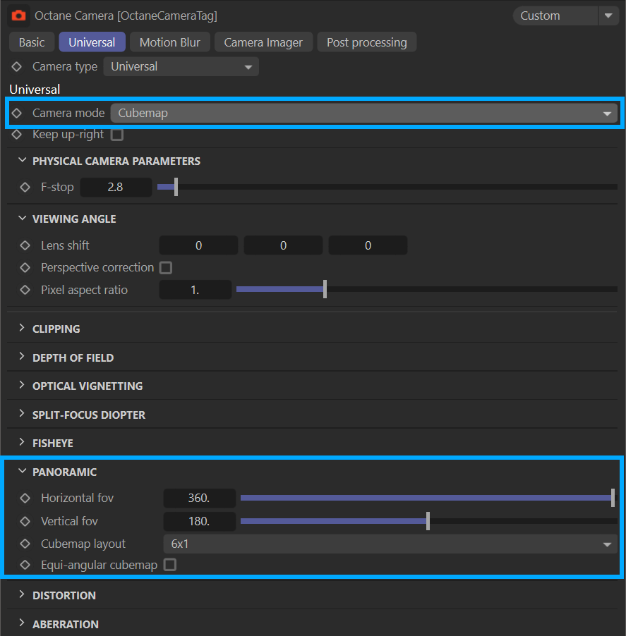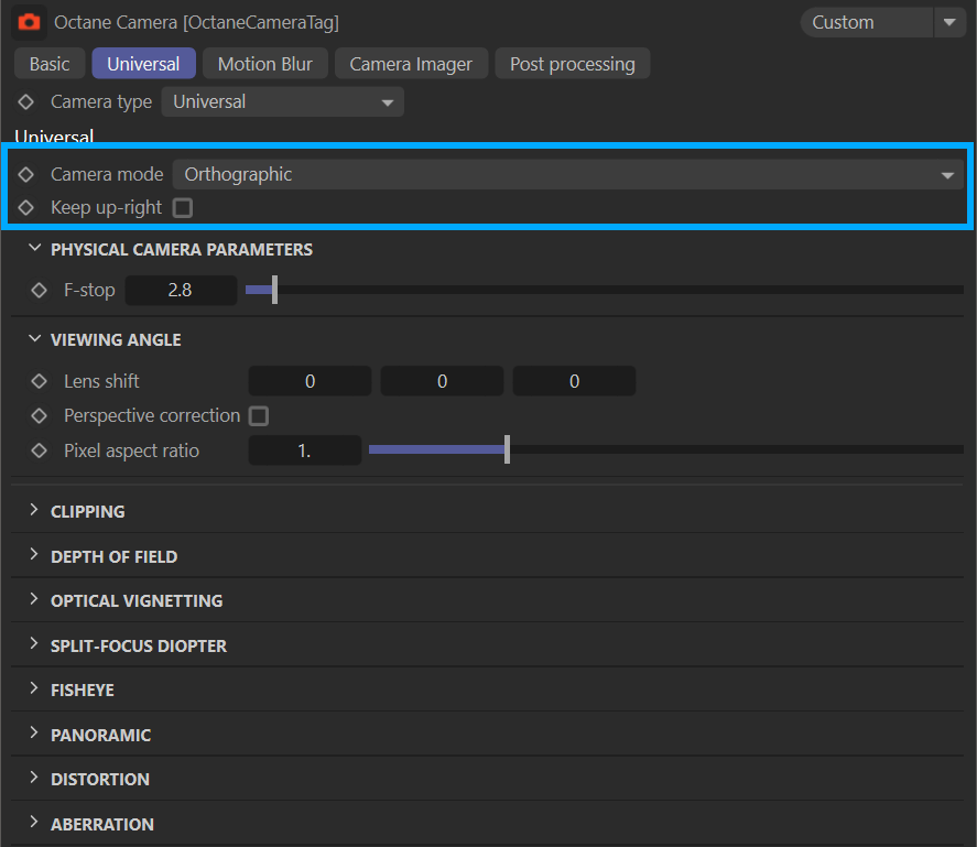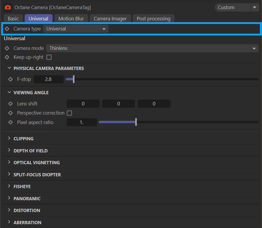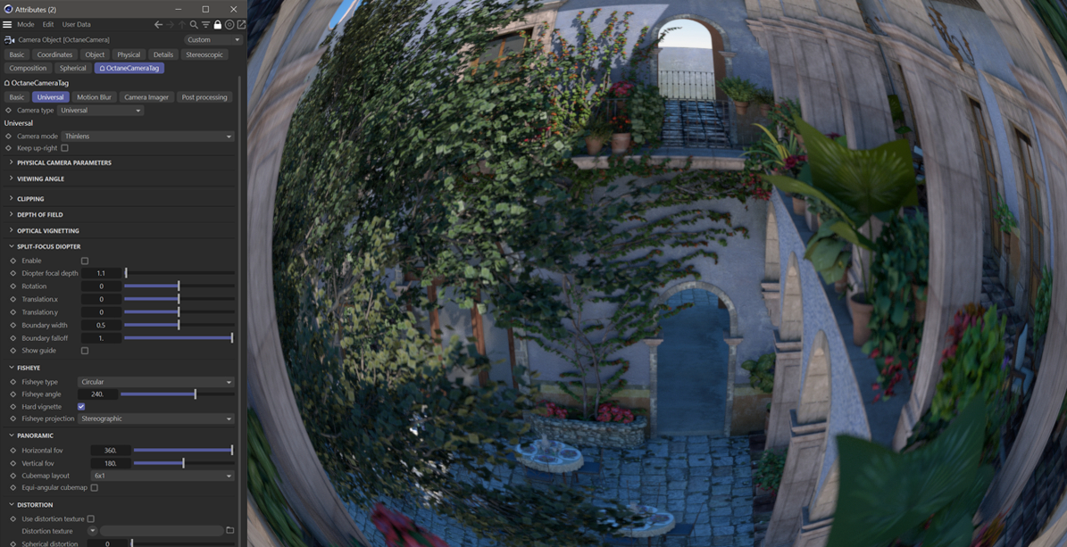 OctaneRender® 中的通用相机是一种功能齐全的相机,具备大量模拟真实世界摄影镜头的特性,并支持五种不同的相机类型: