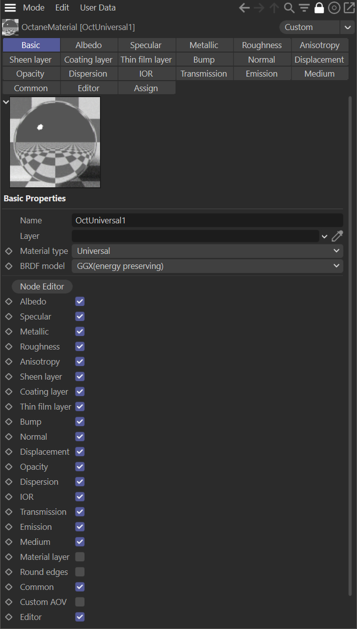 - 编辑器显示 — 决定视口中显示材质的哪一部分。默认“组合”会显示所有通道。对于 Octane 材质应使用该选项,因为列表中的单独通道仅对应 Cinema 4D