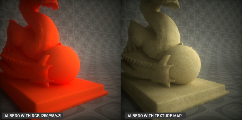 反照率等同于漫反射,但不包含任何阴影、光照方向或环境遮蔽信息。RGB 频谱、高斯频谱、浮点值或图像纹理均可作为反照率的输入。