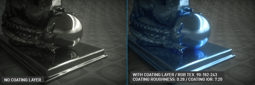 要获得下图所示效果,请在“tex”菜单中选择“RGB”,并设置任意颜色。该颜色会根据高光、反照率或金属参数的使用情况,被分配到材质的最外层。涂层粗糙度与涂层 IOR 共同作用:涂层粗糙度决定涂层的分布程度,而涂层