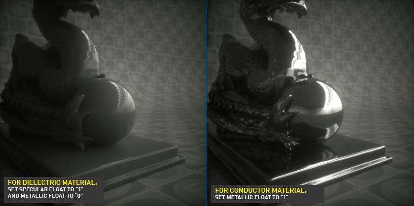 有说明)。默认情况下,该参数为导体,且高光贴图值为默认的浮点值 1,此时“高光”参数会被自动禁用。使用金属参数时,IOR 对结果影响非常大。真实世界材质的 IOR 数据可在 refractiveindex.info 查询。