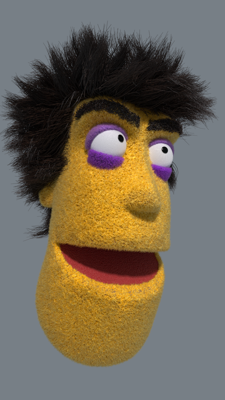 毛发材质用于控制毛发颜色与着色的视觉外观。在该木偶上使用了多个 Cinema 4D 毛发对象与 Octane 毛发材质(此处为“布偶风格”的绒毛/毛绒外观):