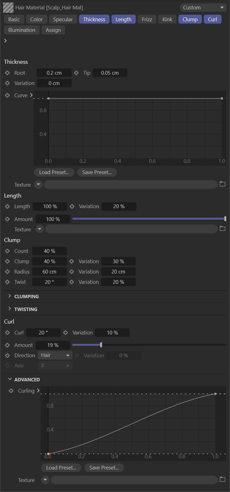 毛发材质来控制毛发的物理特性——粗细、毛躁、簇状等——并使用 Octane 毛发材质来控制毛发本身的着色。关于 Octane 毛发材质的更详细说明请参见 这里。