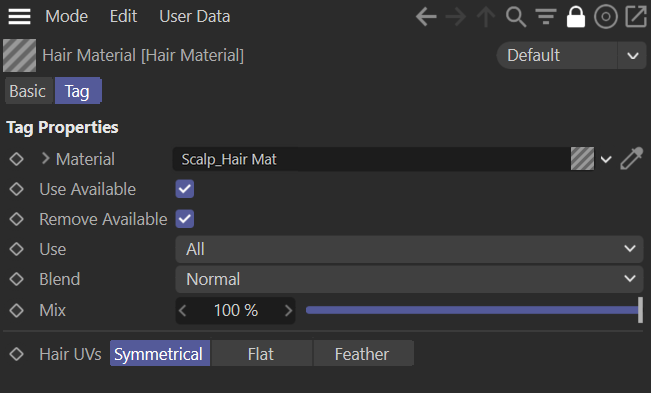 下图展示了毛发材质标签。请确保“材质”槽中显示的是实际 Cinema 4D 毛发材质的名称,否则毛发可能无法正确渲染或无法正确导出到