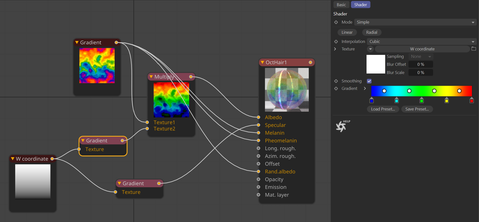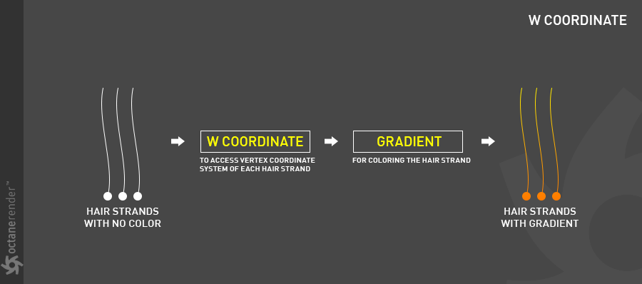 W 坐标纹理节点使头发丝能够沿着整个丝的长度接收颜色渐变。W 坐标用于寻址每根头发丝的顶点坐标系统。没有 W 坐标,Octane 将沿着头发丝的整个长度应用纯色。